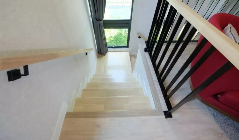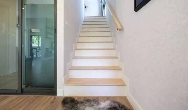 房屋的主楼梯是钢筋混凝土楼梯,上面覆盖着1米宽的合成木楼梯,楼梯宽25.5厘米,楼梯侧面有一个沿着墙壁延伸的扶手。另一边是一面白色的墙,上面涂着光滑的灰泥和油漆。