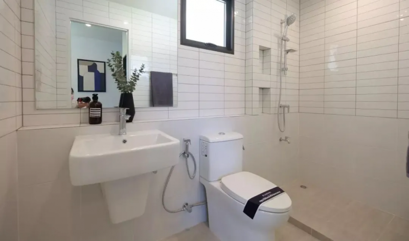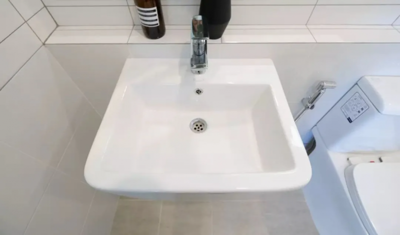 水槽是安装在Low Wall上的BathLine品牌的悬挂式水槽,水龙头是Novabath品牌的单把手,后面有一点空间可以放置东西。