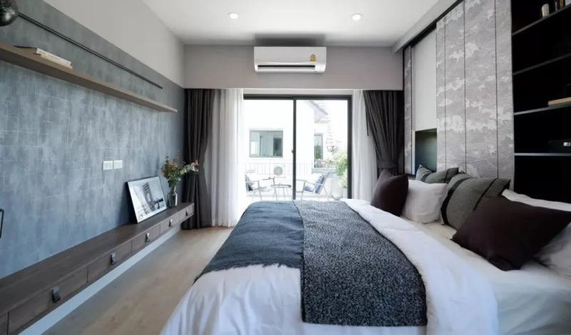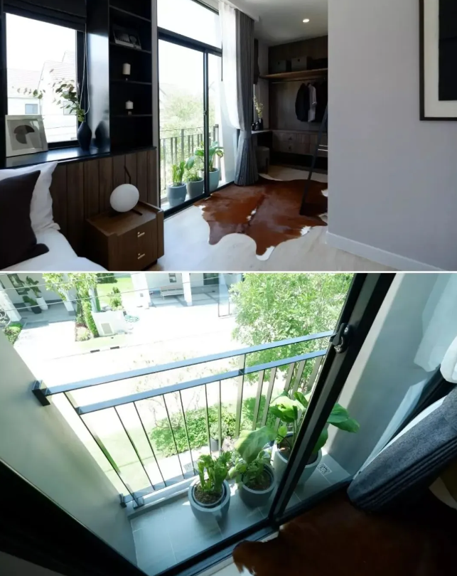 侧面有一个阳台,被滑动玻璃门分成两部分,阳台面积不是很大。您可以打开它进行通风,也可以将其布置成一个小型的装饰性绿地