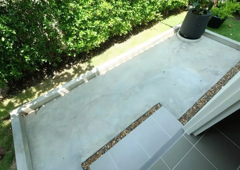 清洗区的走道面积相当宽阔。为了良好的排水,它被降低了。一侧仍有草坪和围栏沿线的空间。楼梯下储藏室的门,可以从这一侧打开