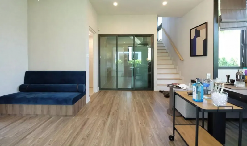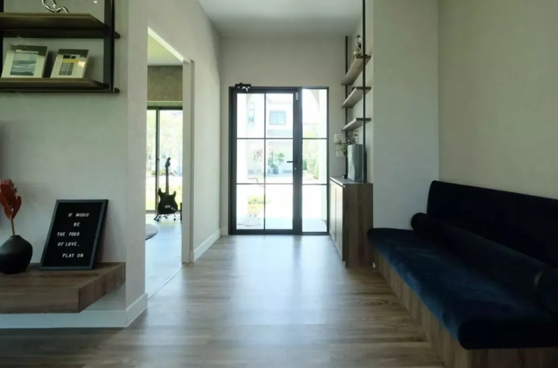 入口门是单扇门,侧面有固定玻璃板。这使得入口大厅拥有自然光。侧面有一角,适合当柜子,放东西或者放鞋子。左侧是多功能厅。一楼房屋内部,地板铺设了SPC橡胶地砖。