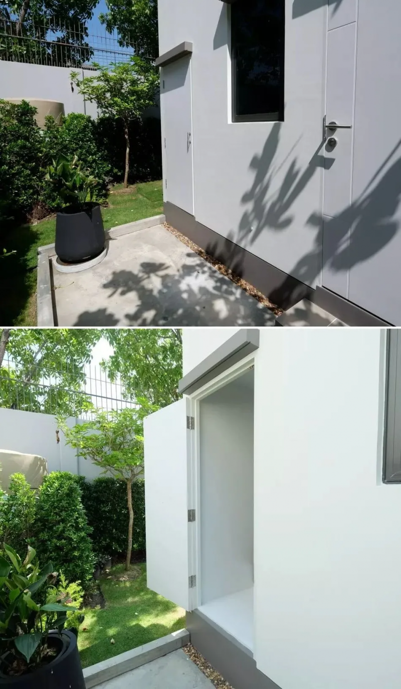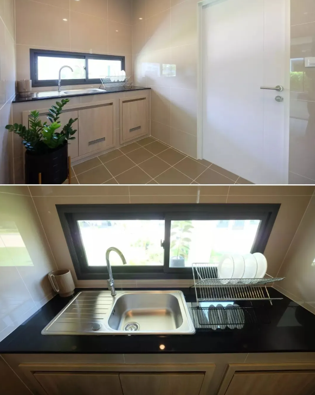 另一边是房子的服务区,是封闭式厨房。该项目将为房屋安装 3 段滑动玻璃门。左边是卫生间的门。