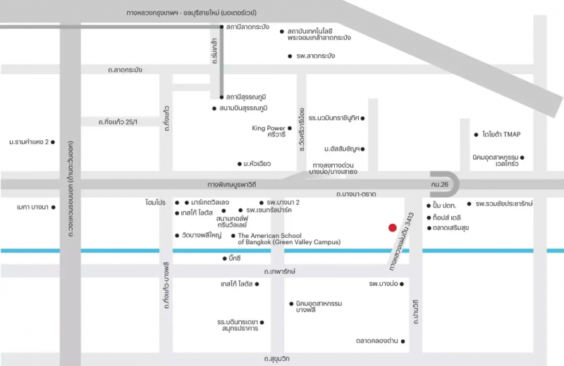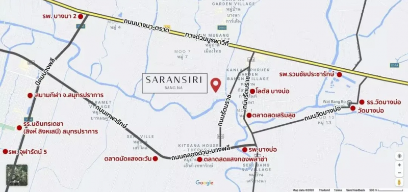 Saransiri Bangna项目被认为位于 Bang Bo 地区。进出的主要路线是 Bangna-Trad 路。这被认为是一条非常热闹的线路。因为这是一个离市区不是很远的地区。它也靠近许多工业区和教育机构。该地区周围还有更多百货商店和社区购物中心开业。例如Mega Bangna Department Store、Central Plaza Bangna、Market Village或距离项目不远的社区生鲜市场,如Sermsuk Market,也可供购物。