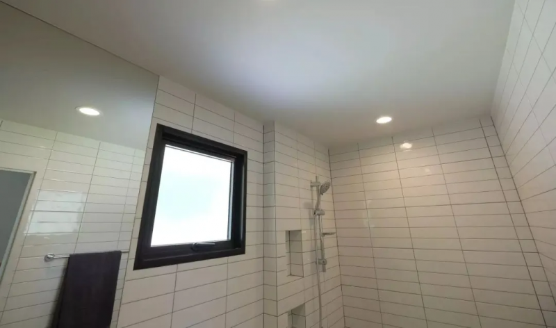 中间有一个推拉窗,用于通风。天花板是光滑的石膏,漆成白色。在 2 点安装筒灯。