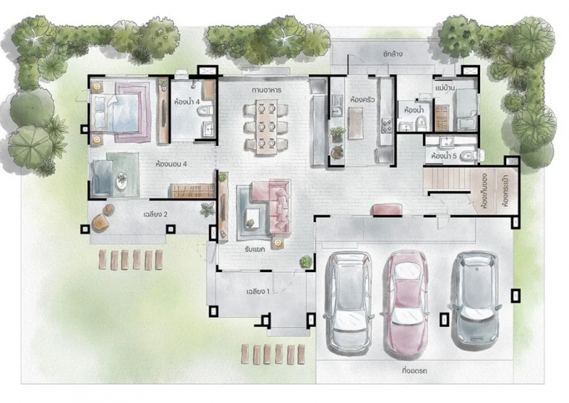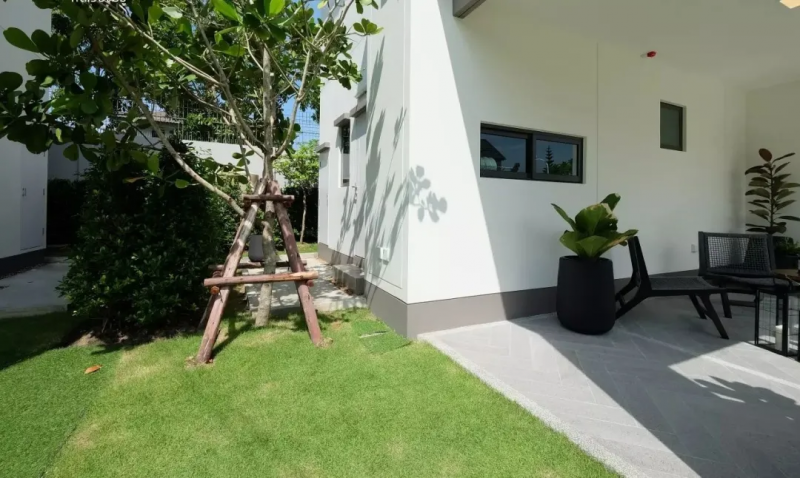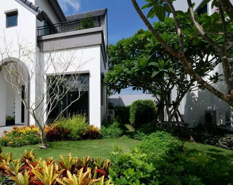 休闲区一侧,如多功能厅、客厅玻璃门窗的使用相当多。房子周围的花园种满了大树和美丽的灌木。可以提供良好的遮荫
