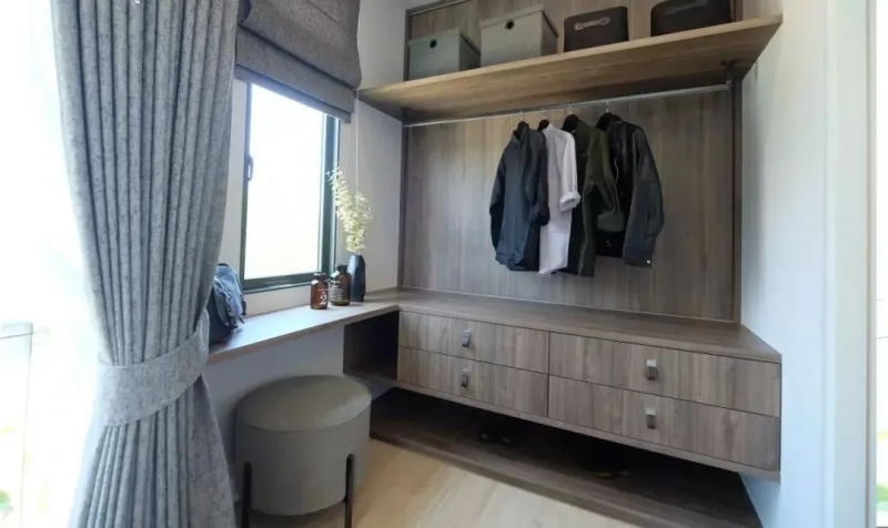 更衣室的梳妆台后面还有一扇打开的窗户,有助于照亮房间。并具有良好的通风性。