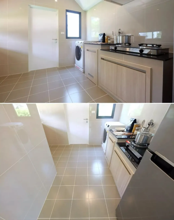 封闭式厨房分为两侧使用,台面铺有花岗岩。下方储物格前门已经安装完毕。柜台左侧预留了1.0×0.60 m的洗衣机空间,右侧放置了0.77×0.60 m的冰箱。厨房内地面铺有瓷砖。优点是耐用且易于清洁。