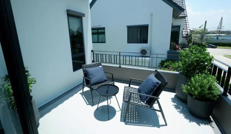 阳台尺寸为3.3×2.7 m,可容纳2套椅子和一个小茶几供坐下和放松。当阳光充足的时候,你会得到不同的气氛。