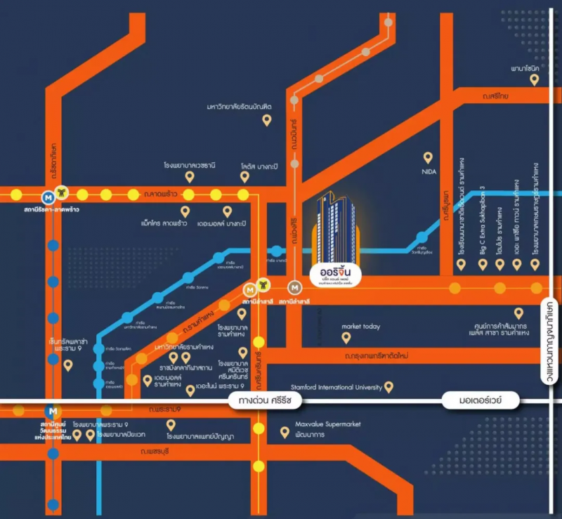 首先必须说的是,这个项目的亮点在于它的位置。未来,如果橙线Lam Sali 站开通运营的话。距离项目约400米(目前需前往黄线林沙里路口站,距离项目800米),这是一个转乘点,最多可连接3条电动火车线路,包括黄 线(Lat Phrao - Samrong)、橙线(文化中心 - Minburi)和棕线(Khae Rai - Lam Sali)使进出城市更加方便。