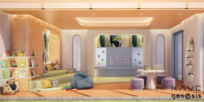 该模型模拟了二楼B楼公共区域,具有室内和室外功能,包括儿童房、午睡角、联合厨房、剧院室、休闲泳池/趣味泳池、按摩浴缸、标志性的趣味滑块和休闲区。