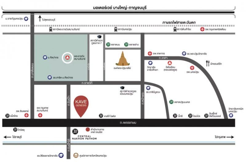 该项目的地图显示了 Kave Genesis Nakhon Pathom 的位置这条路将是一条与 Rajavithi 路平行的道路,Rajavithi 路是 Silpakorn 大学、Sanam Chan Palace 校区和 Ong Prapathom 宝塔的所在地。