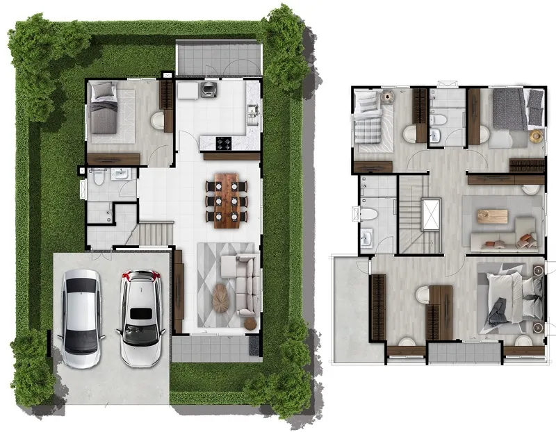Suphacharin住宅模型, 2层半独立式别墅,该项目最大的户型。可用面积 154 平方米,可满足您的需求:4 间卧室、3 间浴室和 2 辆车的停车位。房子采用热带现代风格设计,将自然完美融入房子。