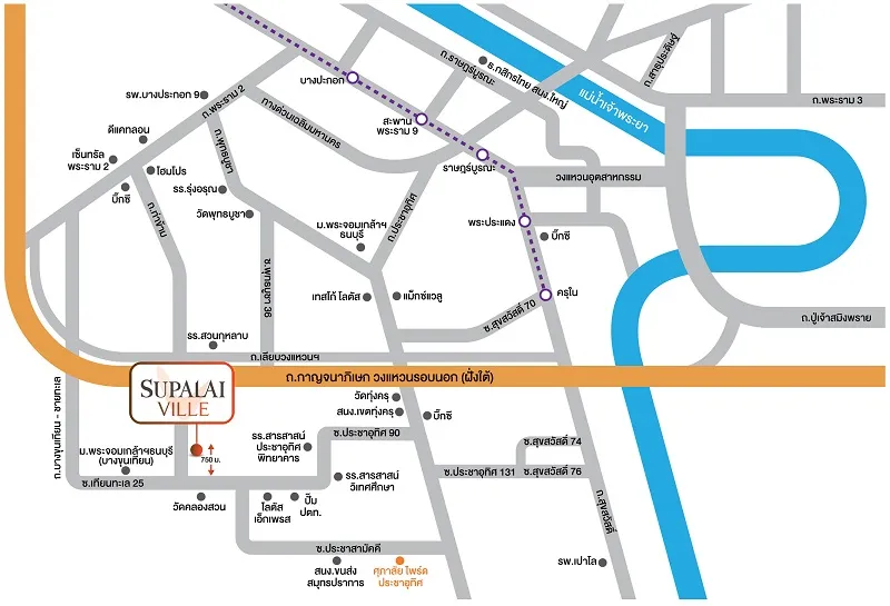 Supalai Ville Pracha Uthit 90 位于Soi Pracha Uthit 90,该位置连接所有便利设施。可用于 Rama 2、Pracha Uthit 和 Suksawat 两侧。出行轻松便捷,靠近市区。可连接许多主要和次要道路,如 Soi Thian Talay 25、Soi Anamai Ngam Charoen、Soi Pracha Uthit 131、Soi Pracha Samakkhi (Soi Krathing Daeng)